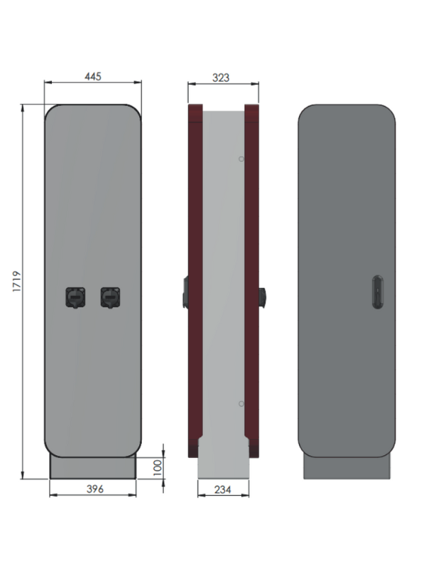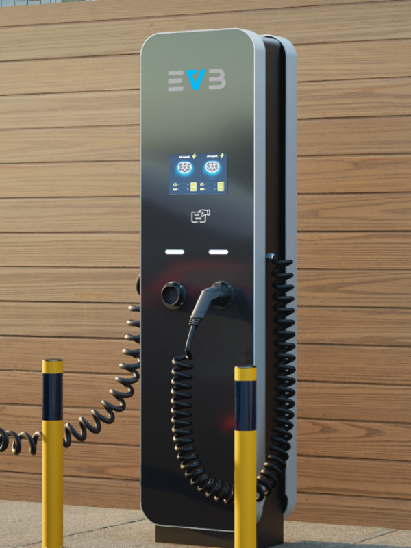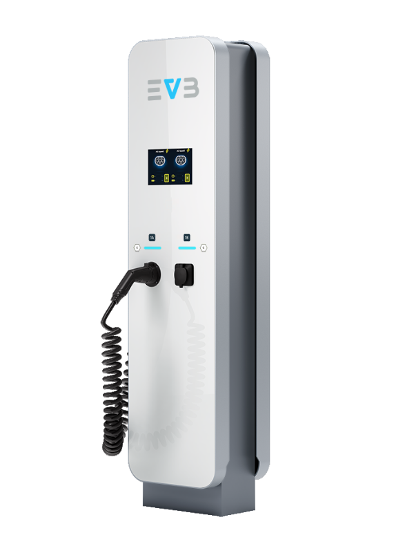 EVB 2M – stacja dwustanowiskowa (2 punkty ładowania), do równoczesnego ładowania, wolnostojąca montowana na płycie lub fundamencie betonowym. Odpowiednia na parkingi zewnętrzne naziemne; obiekty handlowe, obiekty komercyjne, obiekty wielorodzinne, inne ogólnodostępne. PRODUKT POLSKI.