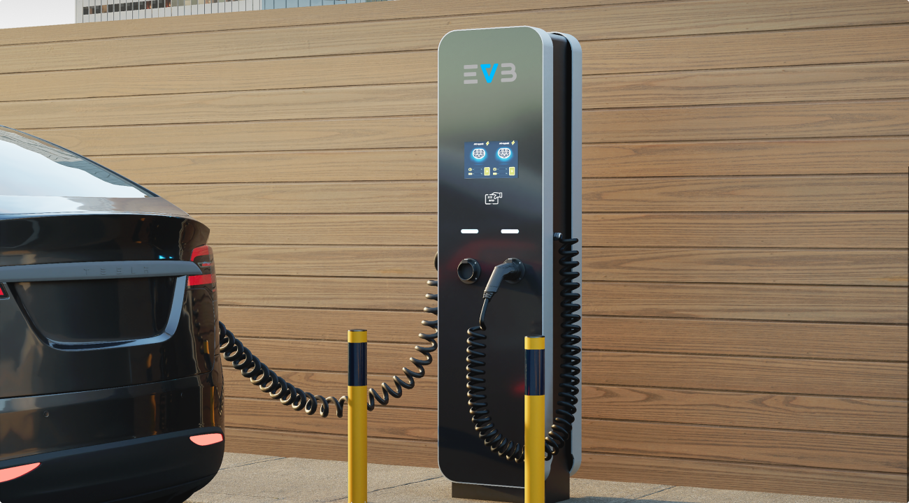 EVB 2M – stacja dwustanowiskowa (2 punkty ładowania), do równoczesnego ładowania, wolnostojąca montowana na płycie lub fundamencie betonowym. Odpowiednia na parkingi zewnętrzne naziemne; obiekty handlowe, obiekty komercyjne, obiekty wielorodzinne, inne ogólnodostępne. PRODUKT POLSKI.